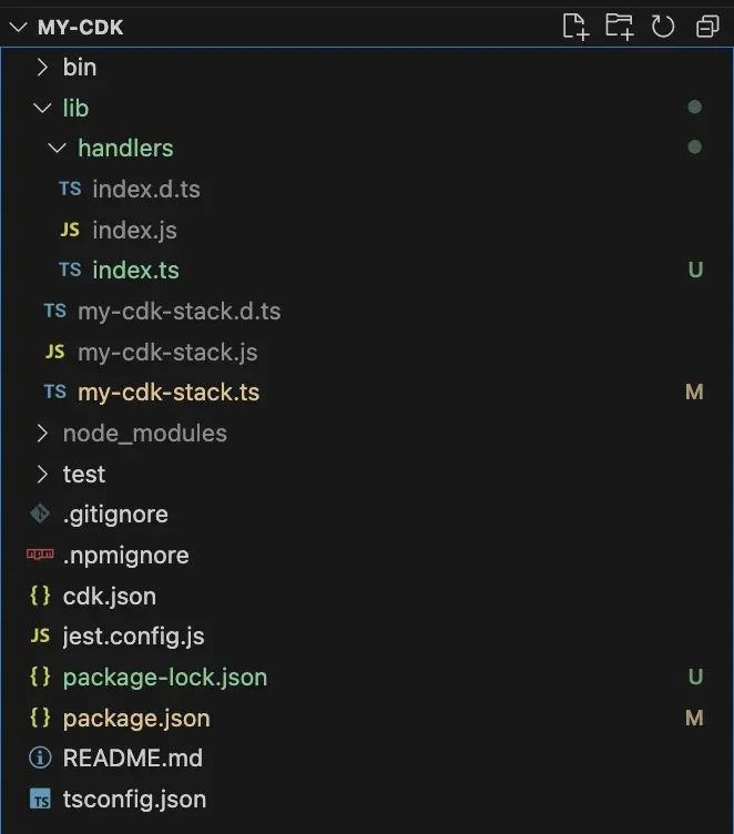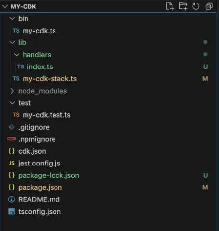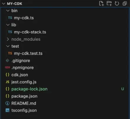 The cdk init command creates a structure of files and folders within the my-cdk directory to help organise the source code for your CDK app. This structure of files and folders is called your CDK project. Take a moment to explore your CDK project. It should look something like this: