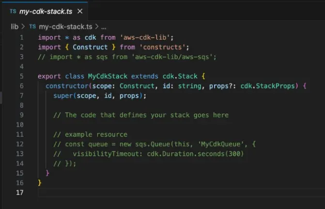 During project initialization, the CLI creates a CDK app containing a single CDK stack. The CDK app instance is created using the App construct. The following is a portion of the default script from your CDK application file, located in lib/my-cdk-stack.ts: