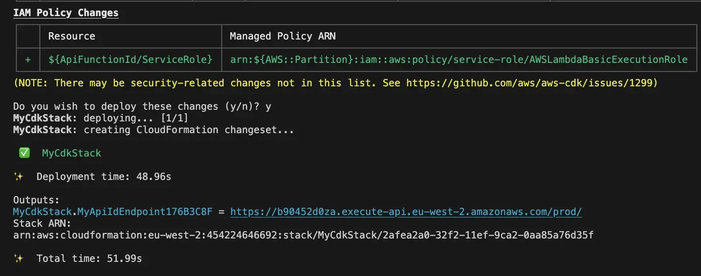 3. You will be asked: ‘Do you wish to deploy these changes (y/n)?’. Confirm ‘y’ to complete the deployment of the stack to your AWS account.
