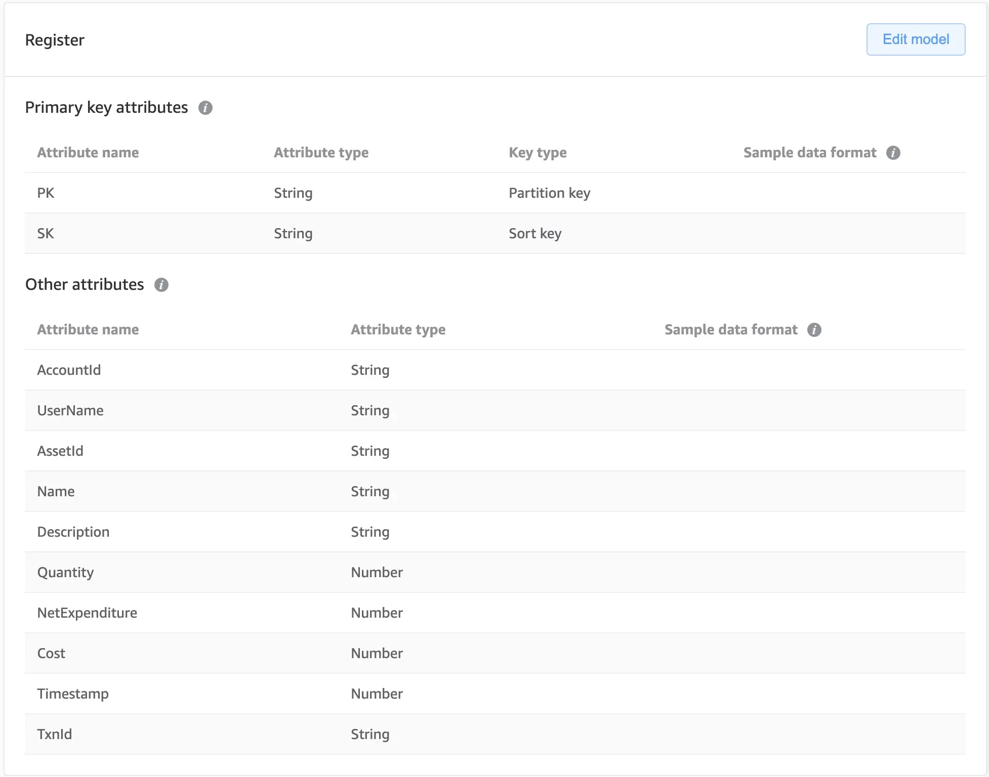 Having created a new data model within NoSQL Workbench containing our ‘Register’ table, via the ‘Data modeler’ tab, we have assigned our primary key attributes to the table, alongside all other unique attributes that were identified for our data entities in step one. Note that, whereas certain fields, such as AccountId and AssetId, span multiple entities, they only necessitate a single attribute within the model.