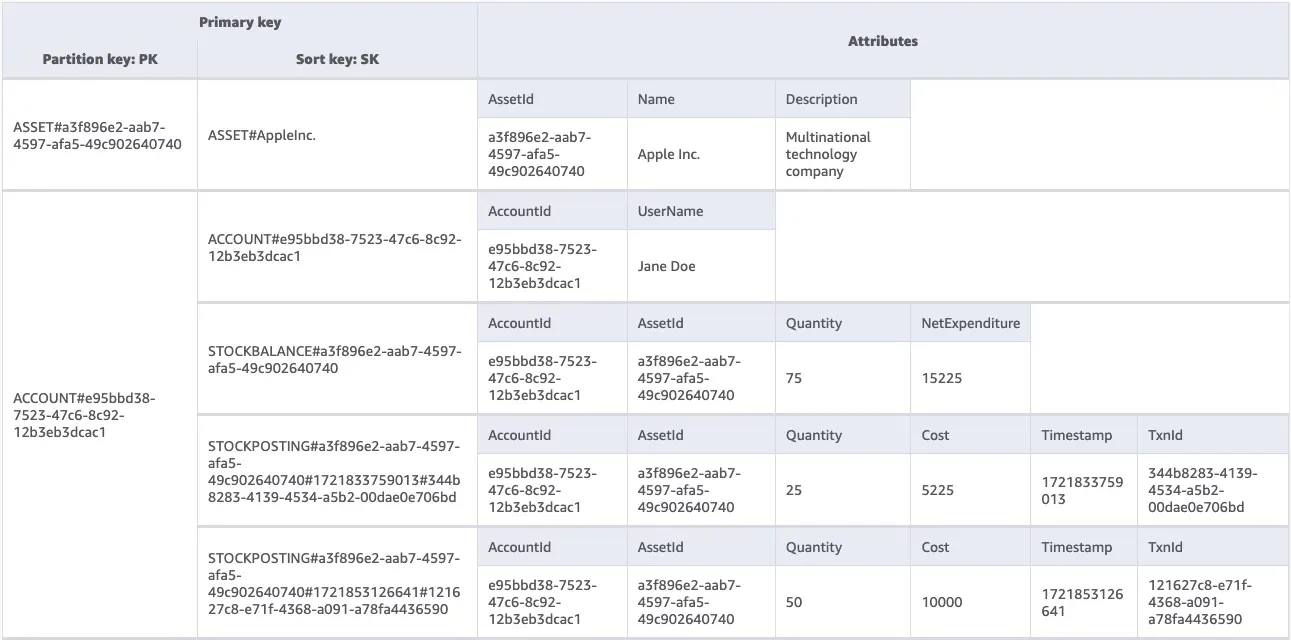- ‘PK = ‘ACCOUNT#<AccountId>’ AND BEGINS_WITH(SK, ‘STOCKBALANCE#<AssetId>’)’ identifies a particular balance entry for an specific account holder and asset