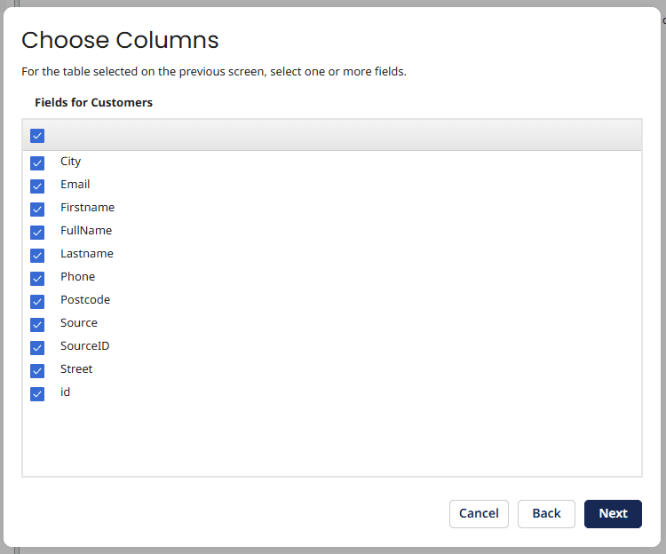 At this point, we can select the fields to send. It would be tempting to select all fields and send the entire record, which you can do if you choose. However, it would be best practice not to do that and just send the ID of the record, then we can query the new record within Boomi.