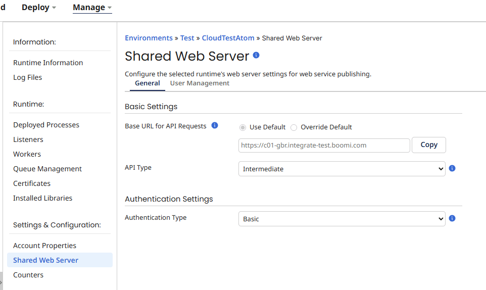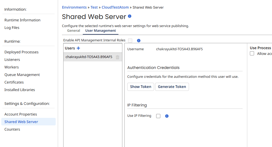 4.Boomi's cloud runtime requires authentication for an incoming HTTP request. The username and token can be found in the shared web server section under the user management tab. Copy the username, click show token and copy this too.