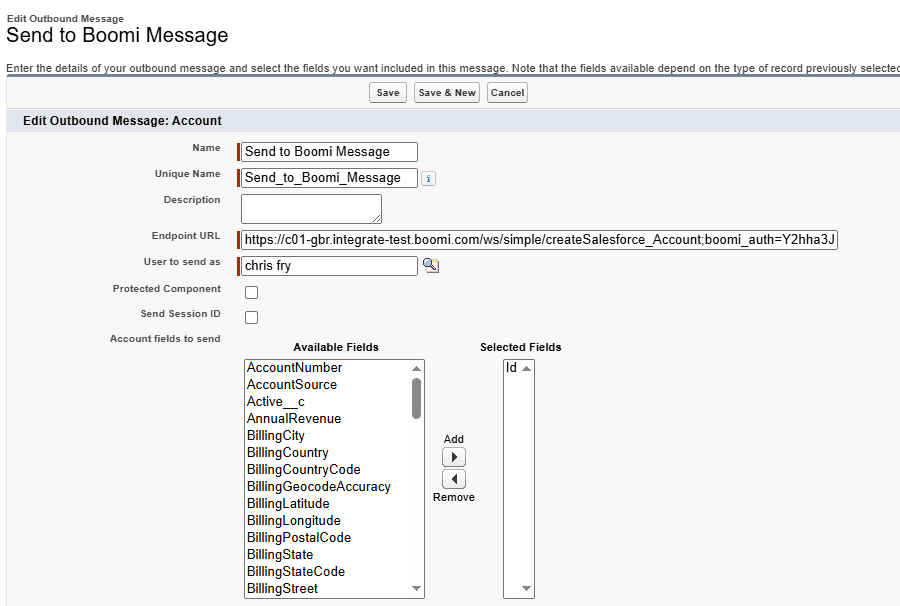 3.Name the message as “Send To Boomi Message” for now, we can also set the Endpoint URL to a holding URL until we have generated the final URL within Boomi later on. You can also set the user to an integration user if you wish; otherwise, leave it as your user.