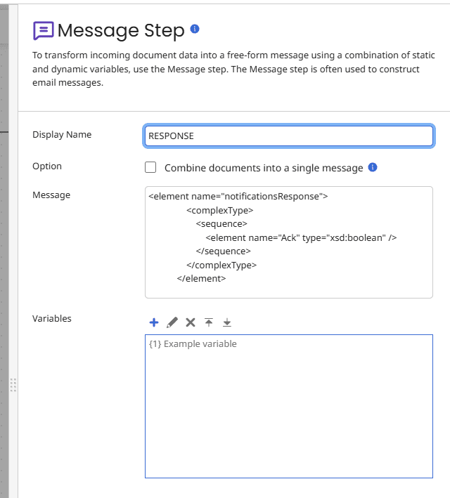 1.In our Boomi process, we are going to add a message object with the below XML in it and after that, a Return Document object. This will return the XML in the message object back to Salesforce, confirming that we have received it so it doesn't keep trying to send it.