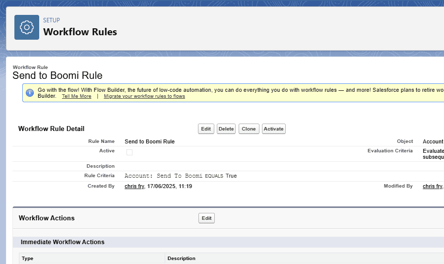 So let's recap, we created a workflow rule which, when a new record is created or edited, and the send to Boomi field is checked, will send an outbound HTTP message to a Boomi Web server listener.