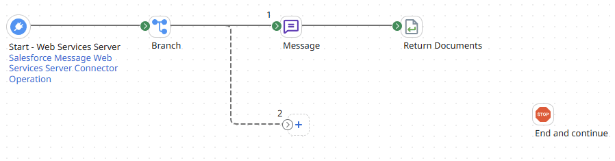 2.Add in a branch after the start shape and connect path 1 to the new message we just created, and the return documents, then add the rest to the second branch. Your process should now look something like this:
