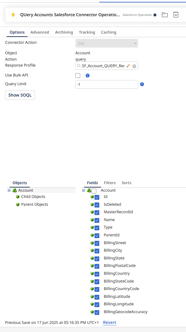 1.Add a Salesforce connector object to step 2 of the branch and configure the authentication details for your Salesforce instance. Note that you would need to use your password combined with the token in the password field.