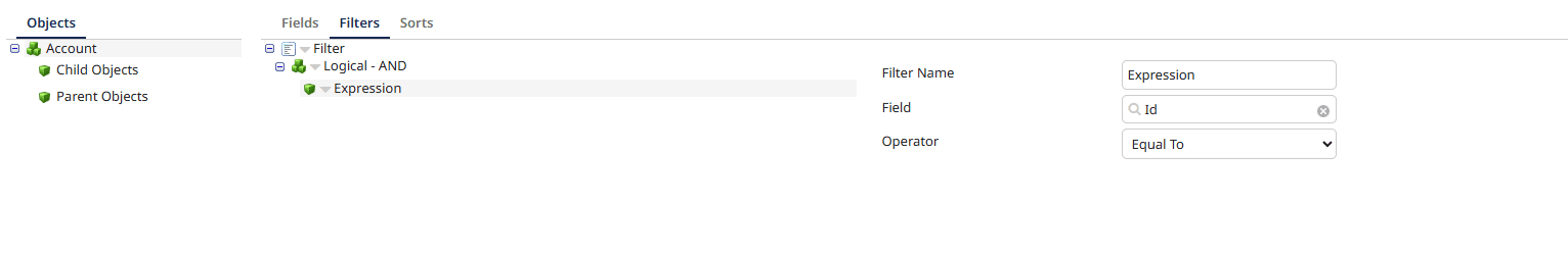 2.Under the filter section, add an expression, the field should be ID, and the operator should be set to Equal To Then click save and close