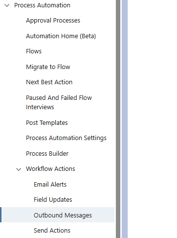 1.Go back to the setup page, then on the left-hand menu go to “Process Automation > Workflow Actions > Outbound Messages”