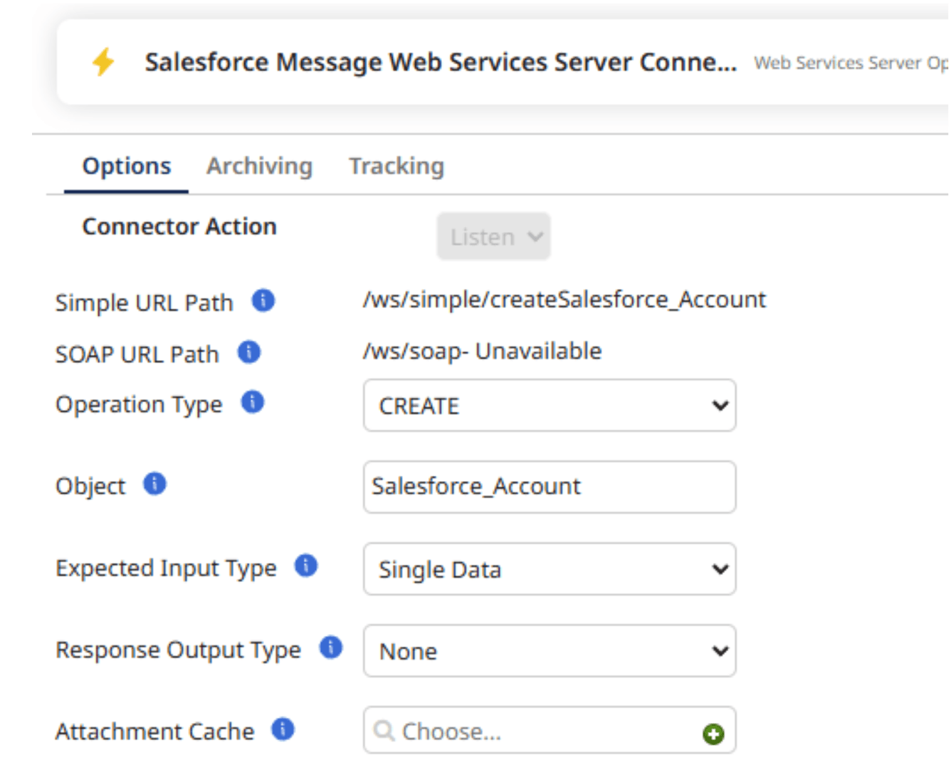 2.Create a new Operation, Name it and set the operation type to create and the object name to Salesforce_Account and expected Input Type to “Single Data”, copy the simple URL Path and keep this for later, then click “save & close”.