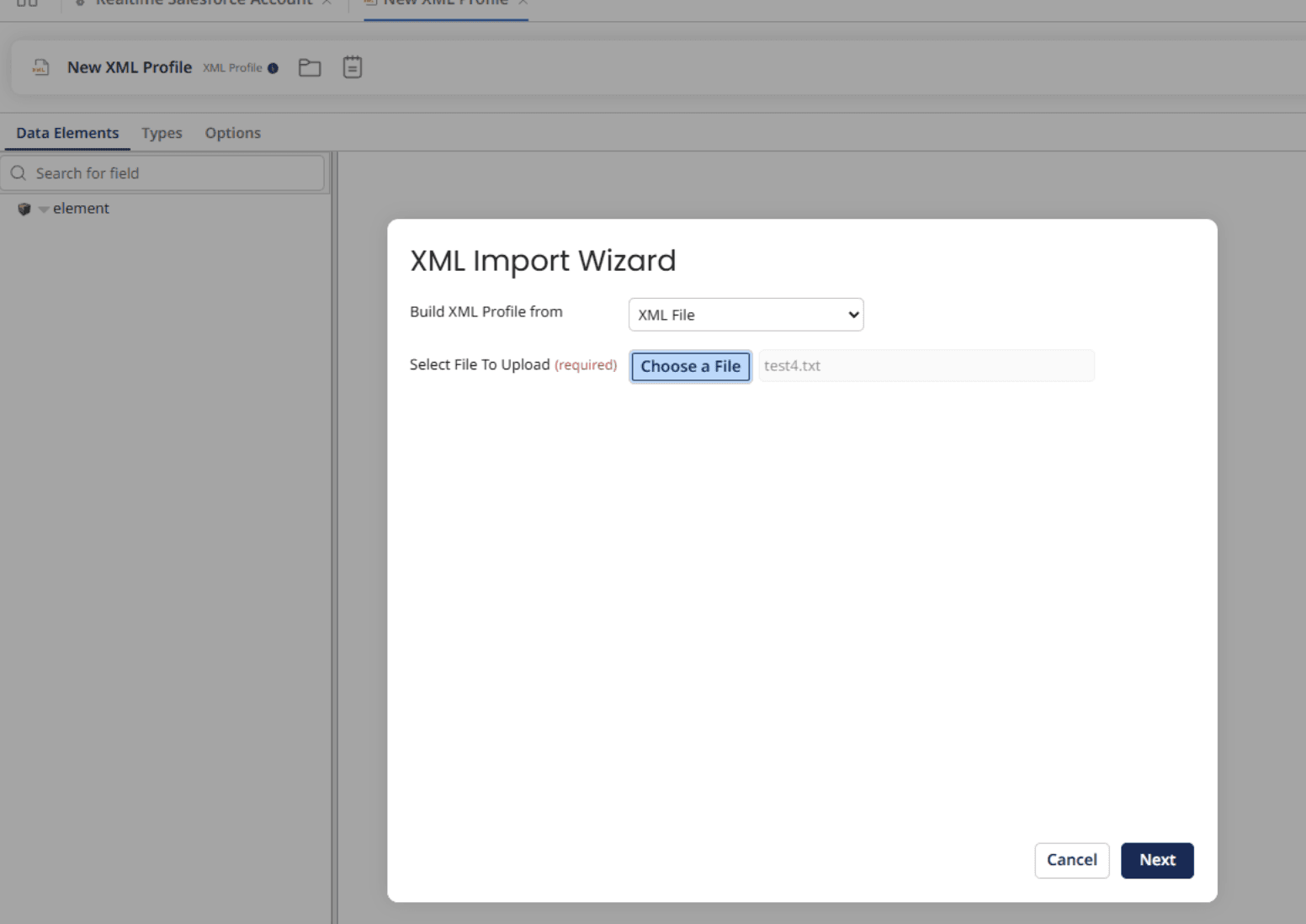 - Create a new XML profile and use the example XML we got earlier with the import wizard.