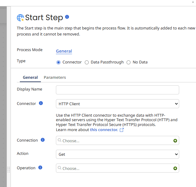 - Step 2: On the start step, select HTTP Client in the connector box, then click the green + in the connection box to create a new connection.