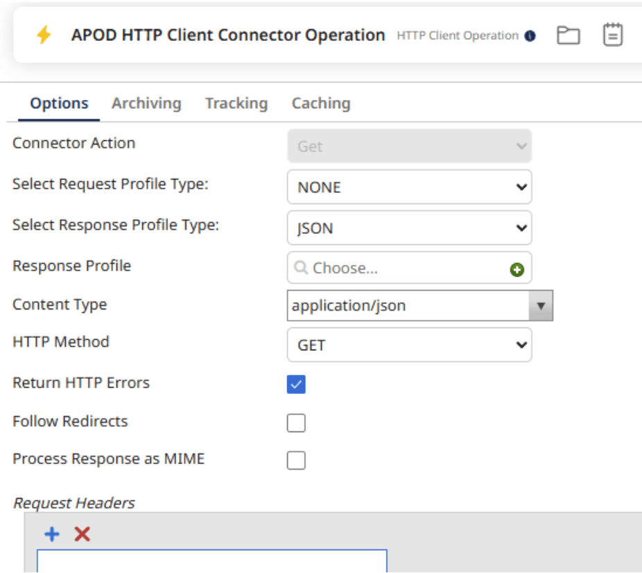 Set the Response profile type to JSON, the content type to application/json and check the return HTTP Errors.