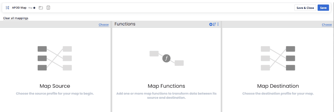 Add the Source profile to the source column by clicking Choose at the top of that column selecting the JSON profile we created earlier. Do the same for the target profile selecting the database profile we generated earlier.