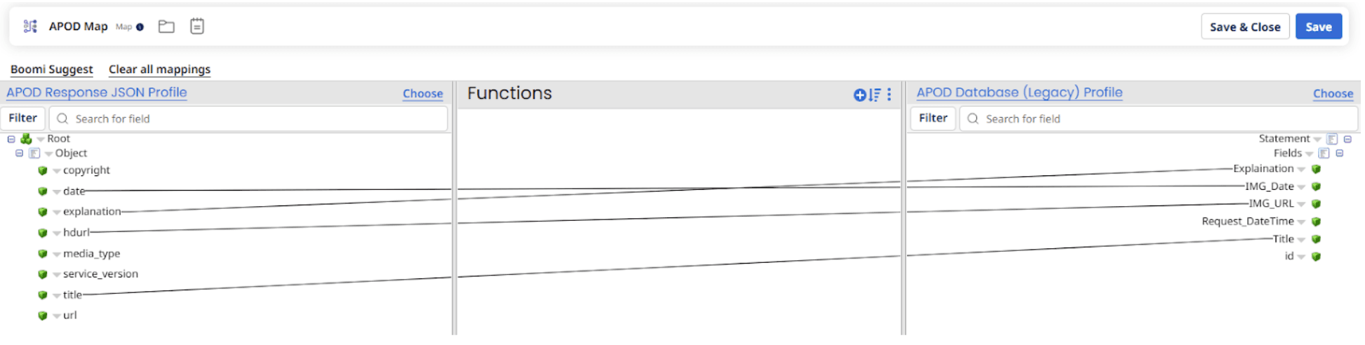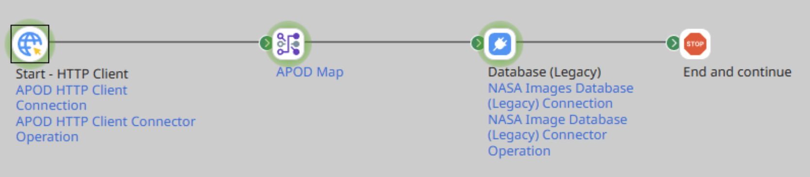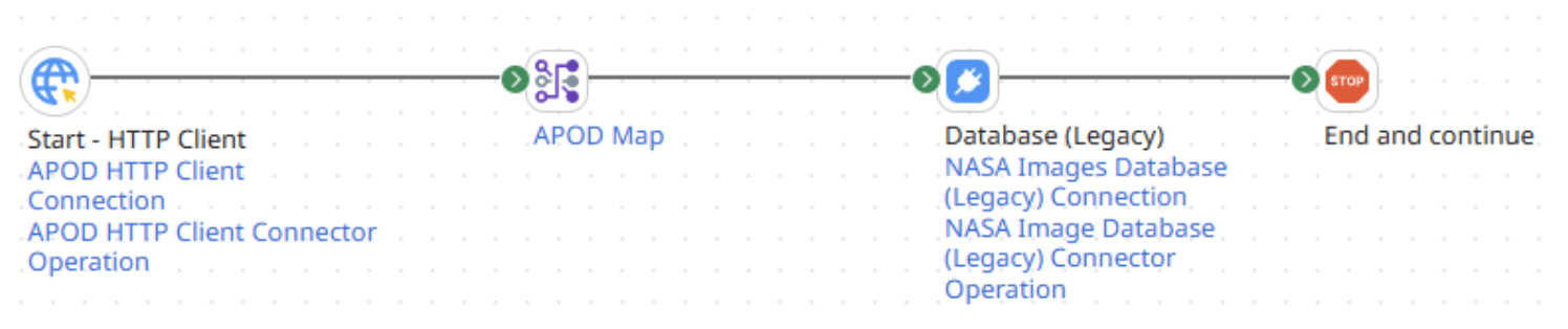So lets recap, we have created a connection from the NASA API using HTTP connector, mapped the JSON output to the Database profile and inserted it in to the database using the database legacy connector. We used the legacy connector as it is preconfigured with the correct JDBC drivers for MS SQL and would save us having to upload and configure our own JDBC drivers.