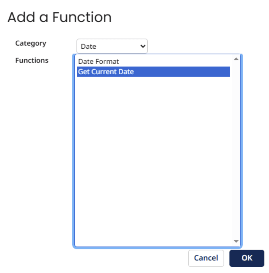 - Step 9: In the functions column, click the blue plus at the top, then select date from the type column and select Get Current Date.